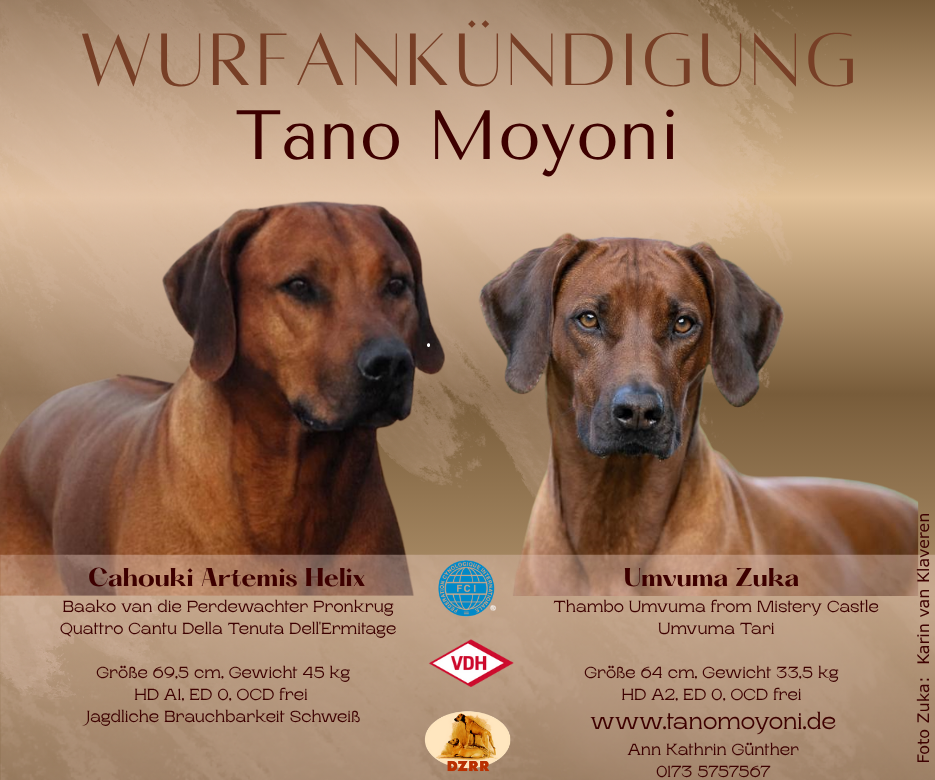 Tano Moyoni  | Tano Moyoni Ann Kathrin Günther Diewergarten 18, DE - 53539 Kelberg 0173 5757567 | Decktermin 17.02.2026 | 1.Wurftermin (21.04.2026)