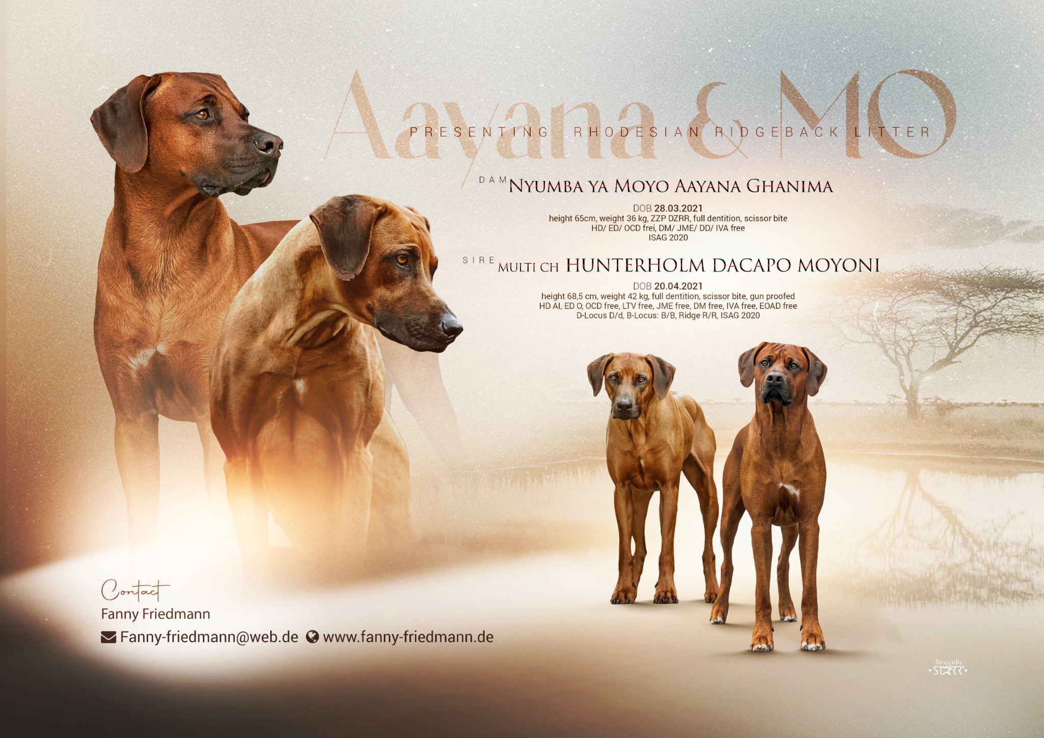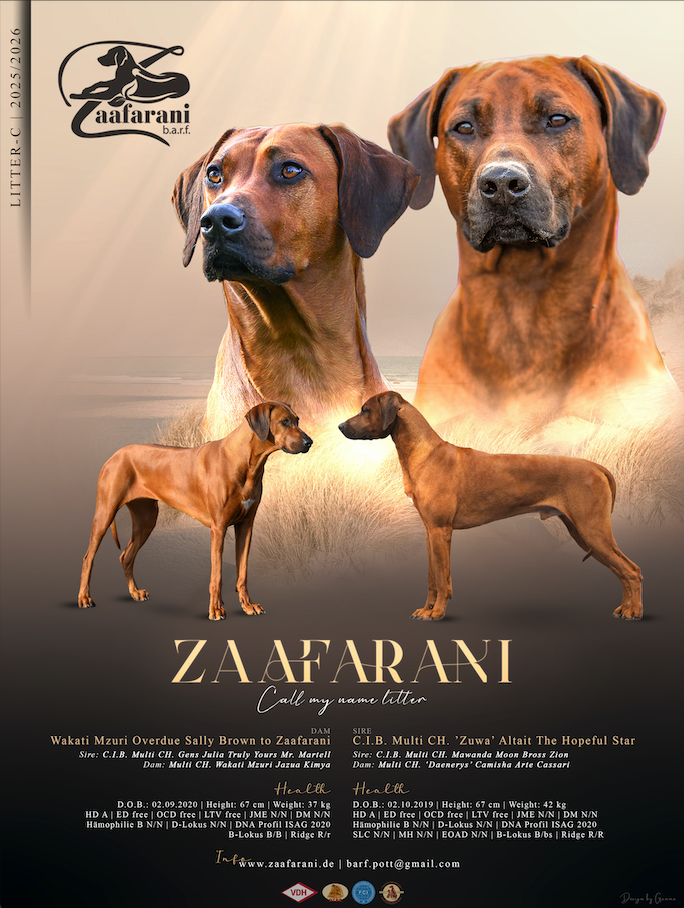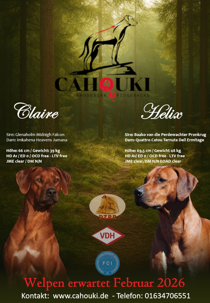 ![]() | Rubin of Afrika Zuchttiere | Thomas und Stephanie Müller DE - 95503 Hummeltal, Untere Wacholderstraße 10 | Wir planen unseren D-Wurf für Frühjahr/Sommer 2026 mit unserer Winnie. Da wir so begeistert und überzeugt von unserem C-Wurf sind, wird es eine Wurfwiederholung mit Hunterholm Dacapo Mo geben. Weitere Informationen und Bilder von unserem C-Wurf unter www.ridgeback-rubin-of-afrika.com. Und telefonisch sind wir unter 0160-7830030 jederzeit für Fragen erreichbar. |