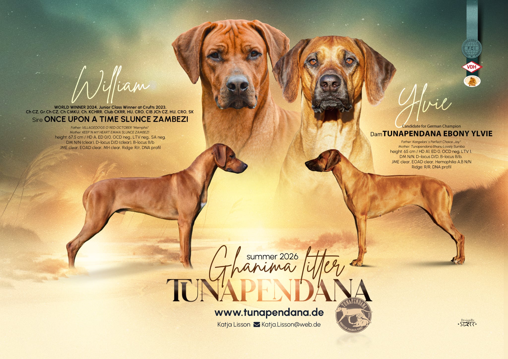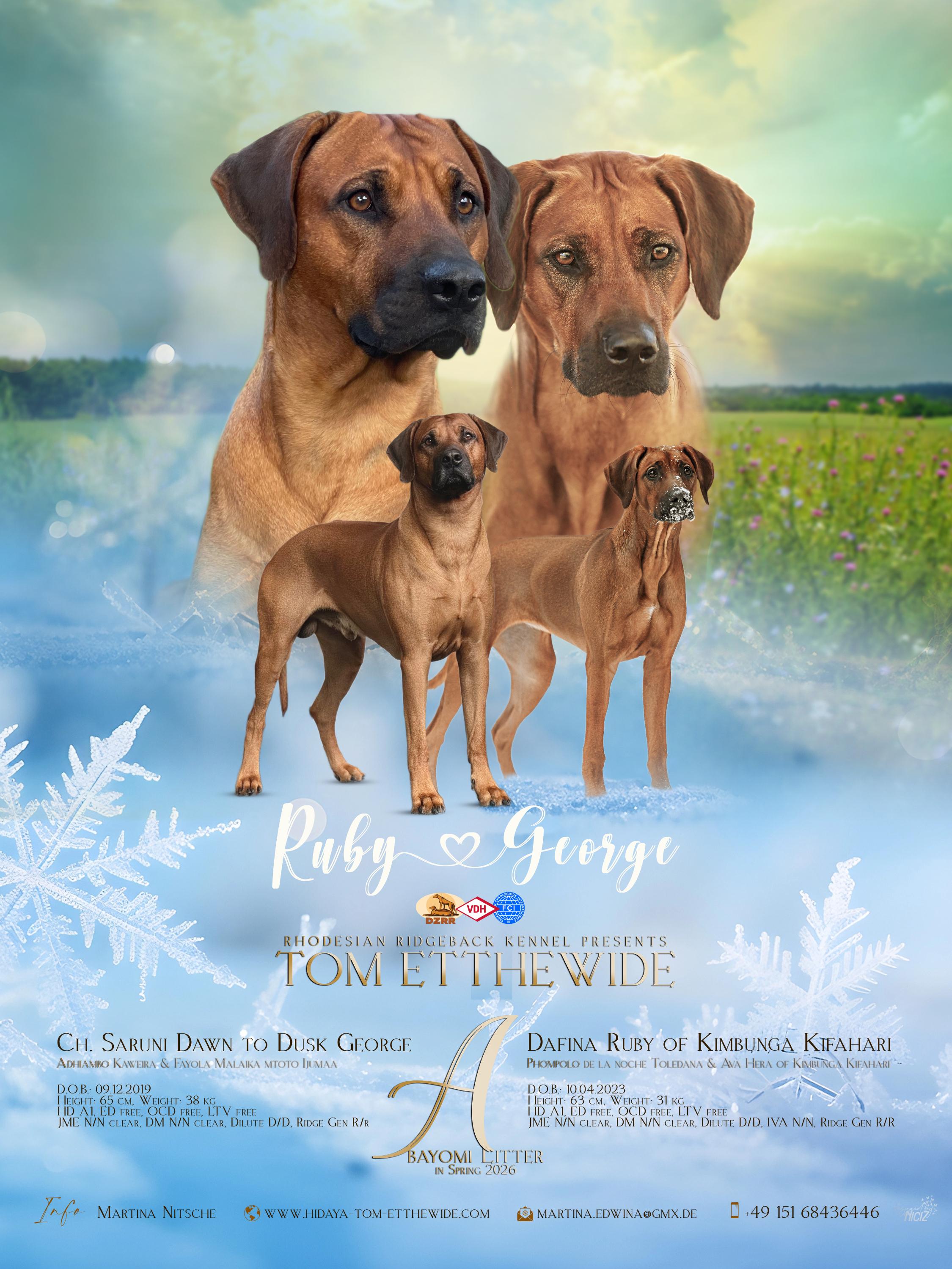 ![]() | tom Etthewide Zuchttiere | Martina Nitsche DE - 07768 Lindig, Dorfstraße 77, 0151 68436446 | Mit großer Freude möchte ich die A-Wurfplanung meiner Hündin Dafina Ruby of Kimbunga Kifahari mit dem wundervollen Ch.Saruni Dawn To Dusk George für das Frühjahr 2026 bekannt geben. Wenn Sie die Leidenschaft zu dieser wundervollen Rasse mit uns teilen und Interesse an einem Welpen aus dieser vielversprechenden Verpaarung haben, so melden Sie sich gerne. Wir freuen uns auf ein persönliches Kennenlernen. |