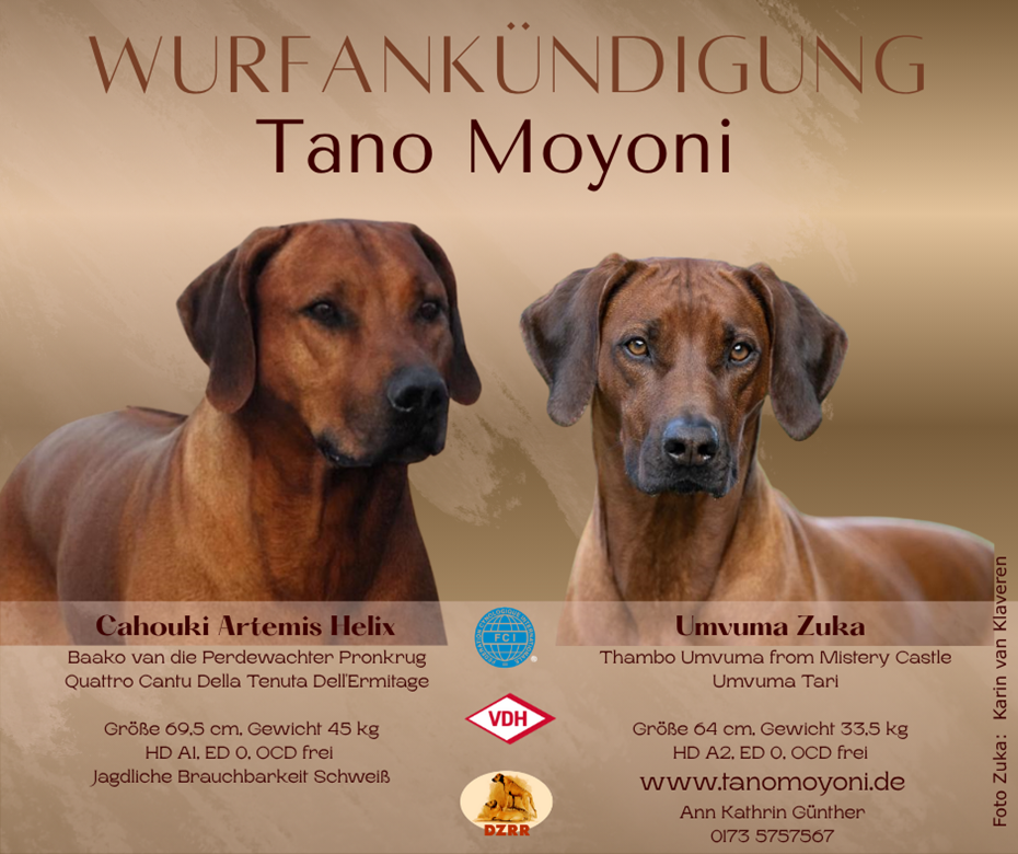 ![]() | Tano Moyoni Zuchttiere | Ann Kathrin Günther DE - 53539 Kelberg, Diewergarten 18, 0173 5757567 | Wir planen unseren Wurf für Winter 2025/2026 (prognostizierte Abgabe der Welpen Mai 2026). Melden Sie sich bei Interesse gerne frühzeitig unter 0173/5757567. |