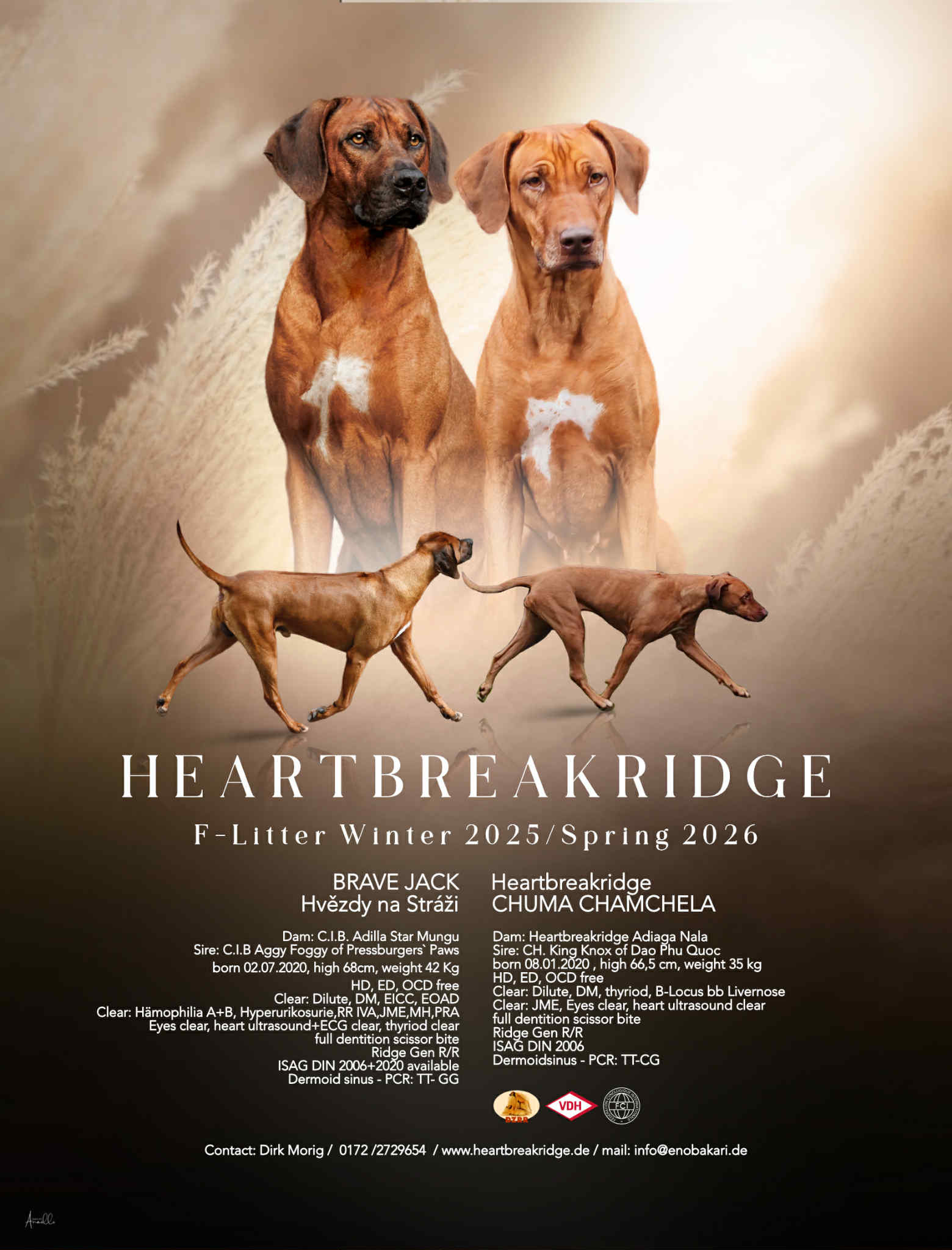 ![]() | Heartbreakridge Zuchttiere | Dirk Morig DE - 38723 Seesen, Langenberger Weg 14 A, 0172 2729654 | F-Wurf im Winter/Frühjahr 2025 mit unserer Nachzuchthündin Heartbreakridge Chuma Chamchela und dem tschechischen Importrüden Brave Jack Hvezdy na strazi. Bei Interesse an einem Welpen aus dieser Verpaarung setzen Sie sich bitte rechtzeitig mit uns in Verbindung. |
